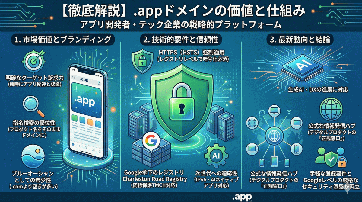 こうした背景から、.app ドメインは単なるダウンロードリンクの置き場所を超え、「自身の専門サービス(AIアプリの正規窓口、APIドキュメント、サブスクリプションの入り口など)を統合・発信する唯一の公式ハブ」として、その価値が世界的に再評価されています。このドメインは、高度なセキュリティと信頼を前提とした次世代デジタルビジネスの確固たる基盤となり得るのです。