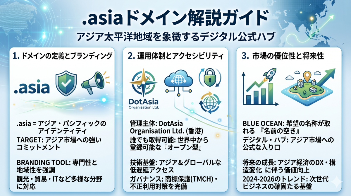 こうした背景から、.asia ドメインは単なるURLの末尾を超え、「アジア市場における専門的なプレゼンス(地域特化型EC、物流管理、デジタルサービス、貿易情報の入り口など)を統合・発信するハブ」として、その価値が世界的に再評価されています。高度な成長性と信頼を前提とした次世代のアジアビジネスの確固たる基盤となり得るのです。