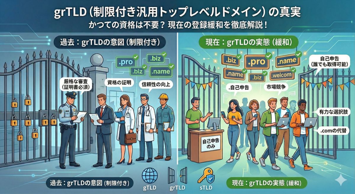 この記事では、grTLD(ジェネリック制限付きトップレベルドメイン)の本来の意味や代表的な種類、そして**「実は現在、かつての厳しいルールは適用されていない」**という意外な実態について、わかりやすく解説します。