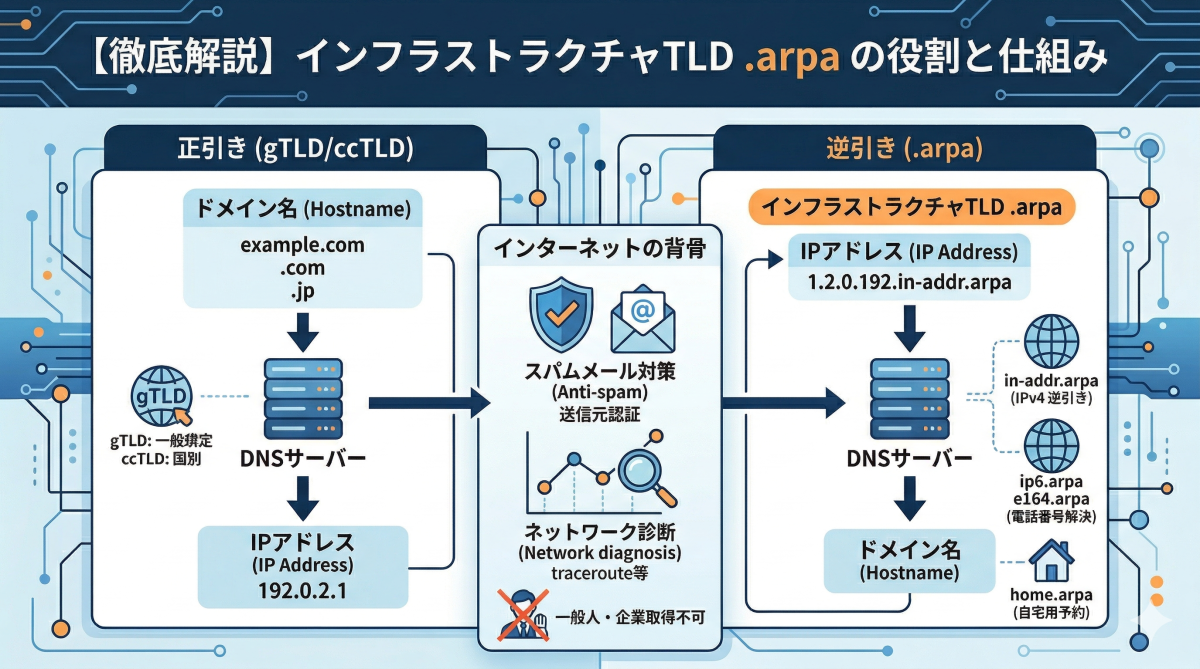 しかし、その反対、つまり**「IPアドレスから名前を調べる」必要がある場面があります。これを「逆引き(Reverse DNS)」**と呼び、ここで活躍するのがインフラストラクチャTLDです。